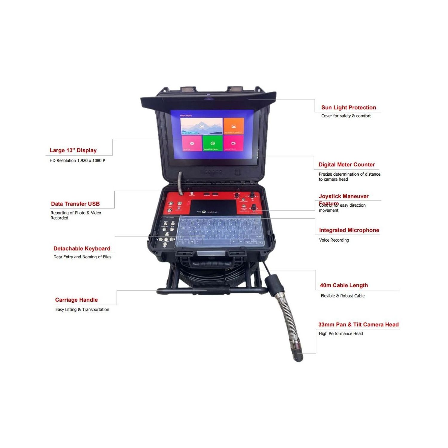 33PT-40 High-Definition Inspection Camera for Pipes From Ø 100mm with 40 Meters Cable and Pan & Tilt Feature